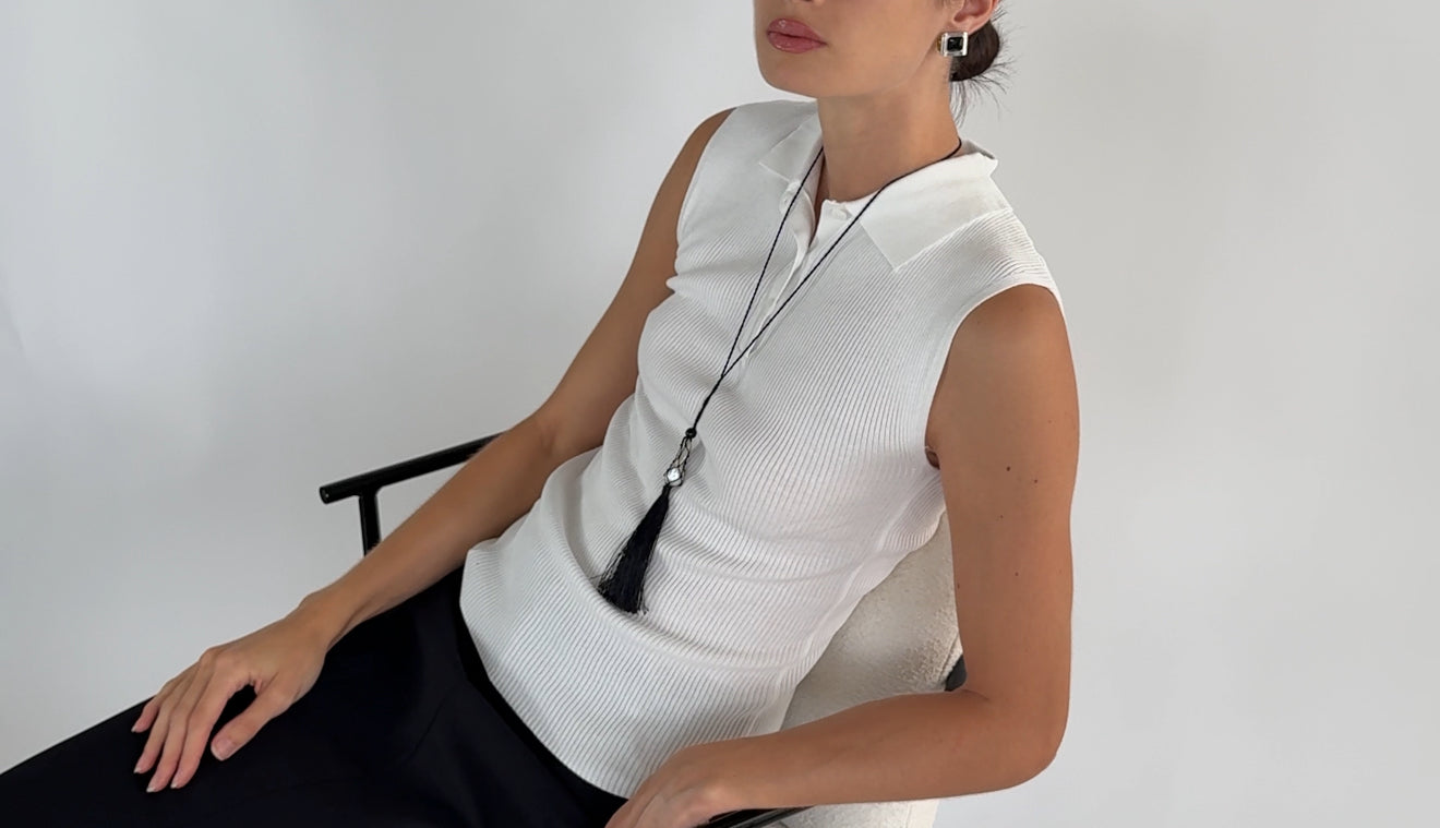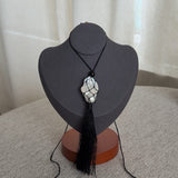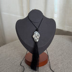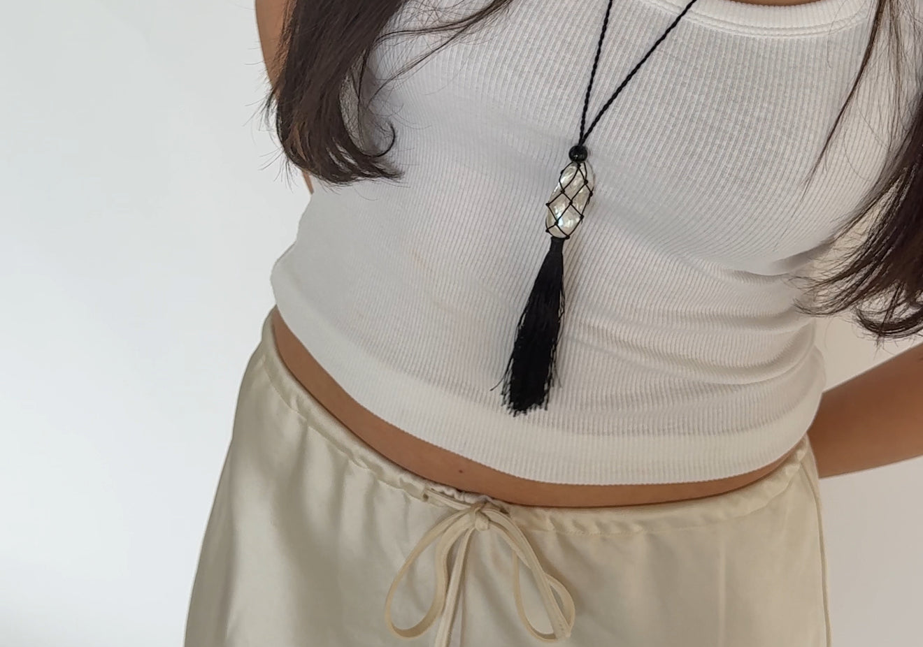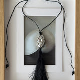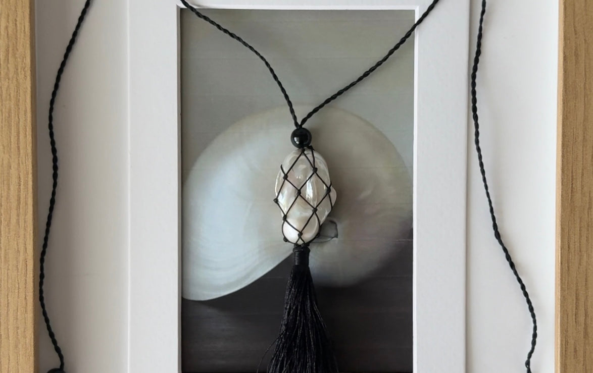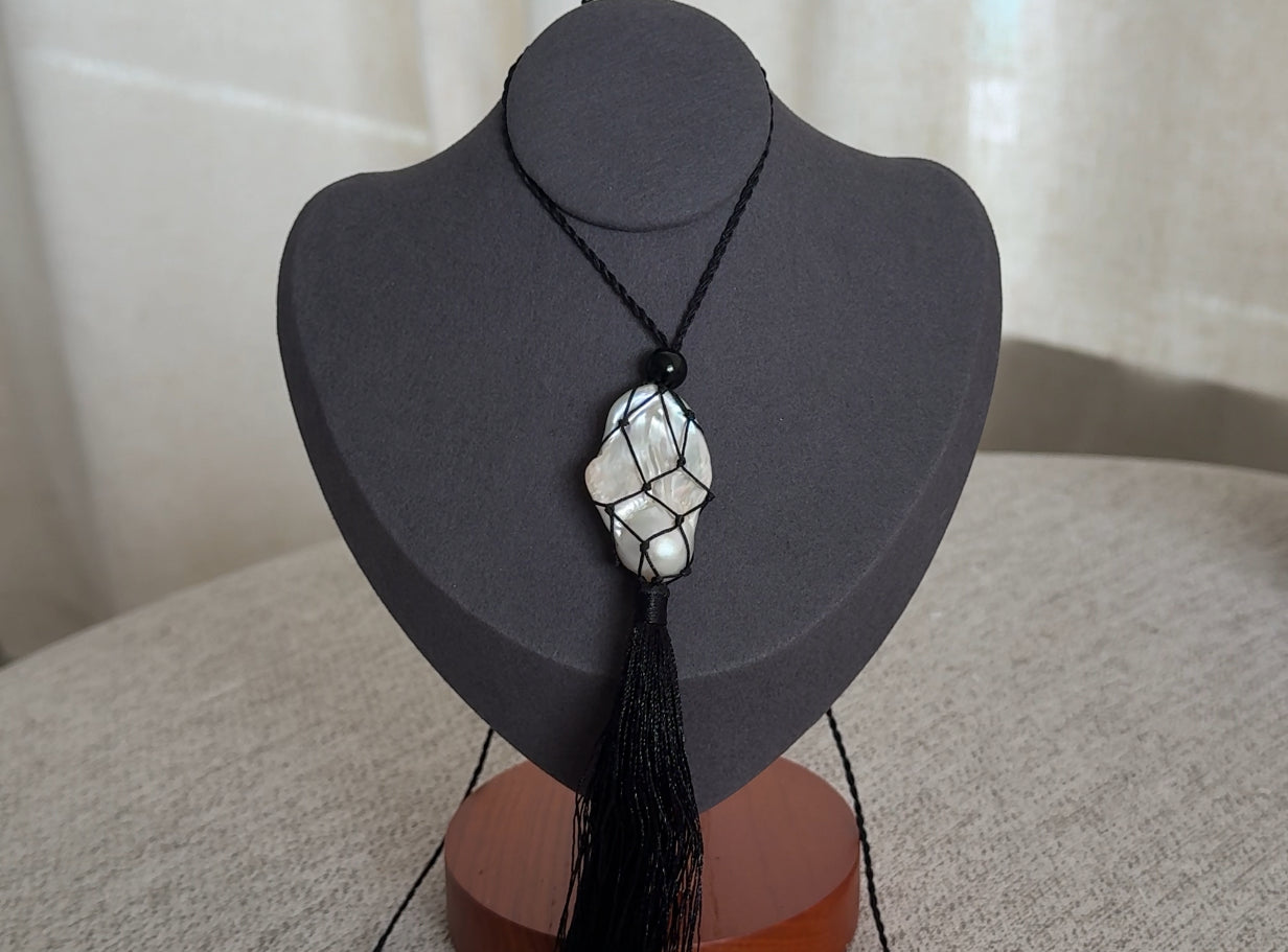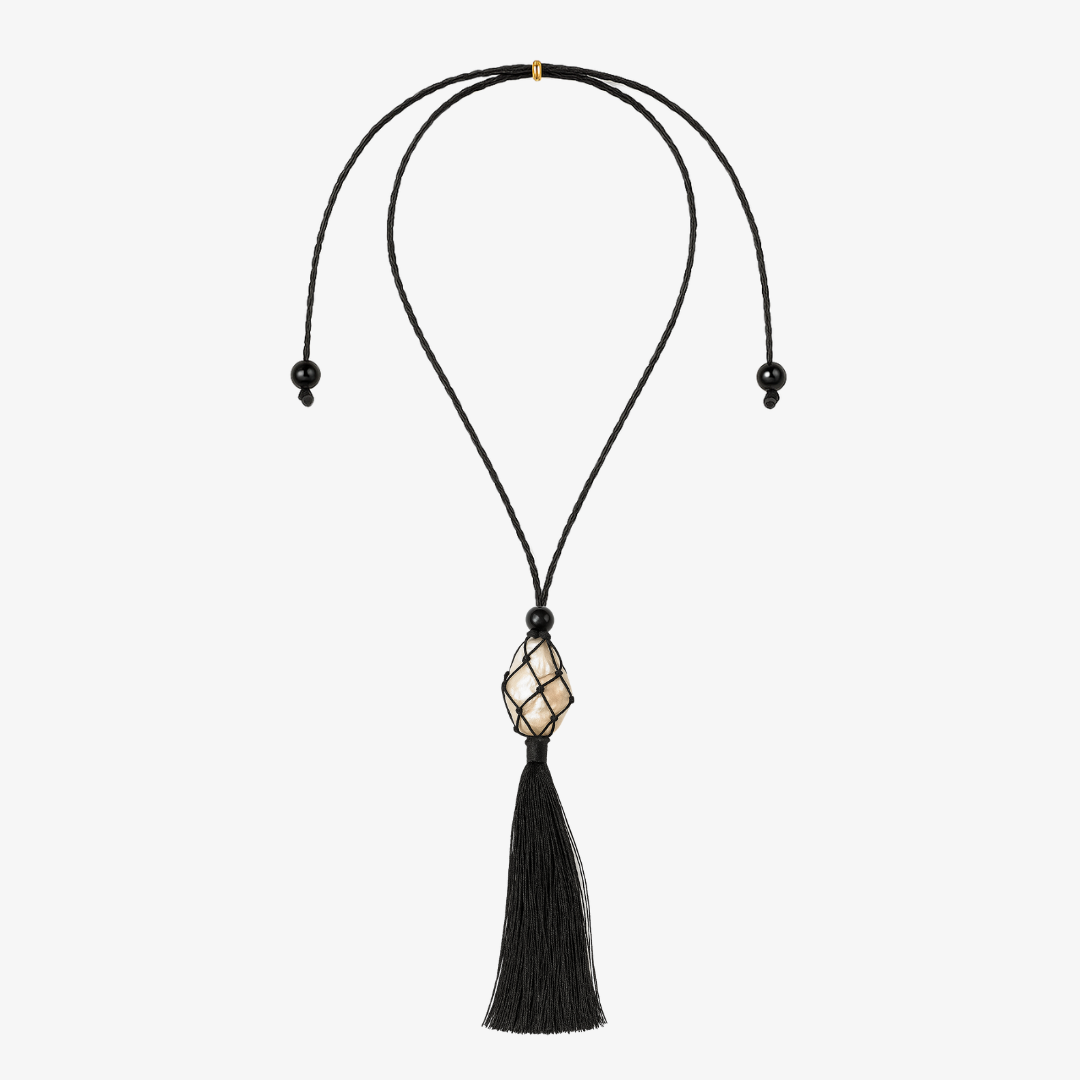 Caspian an ode to the sea. A pearl meticulously wrapped in a net and accompanied by three onyx beads. Featuring a hand wrapped tassel to tie it all together.