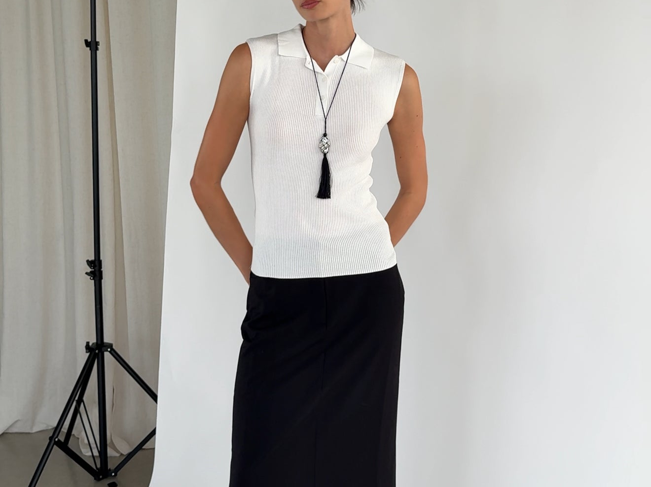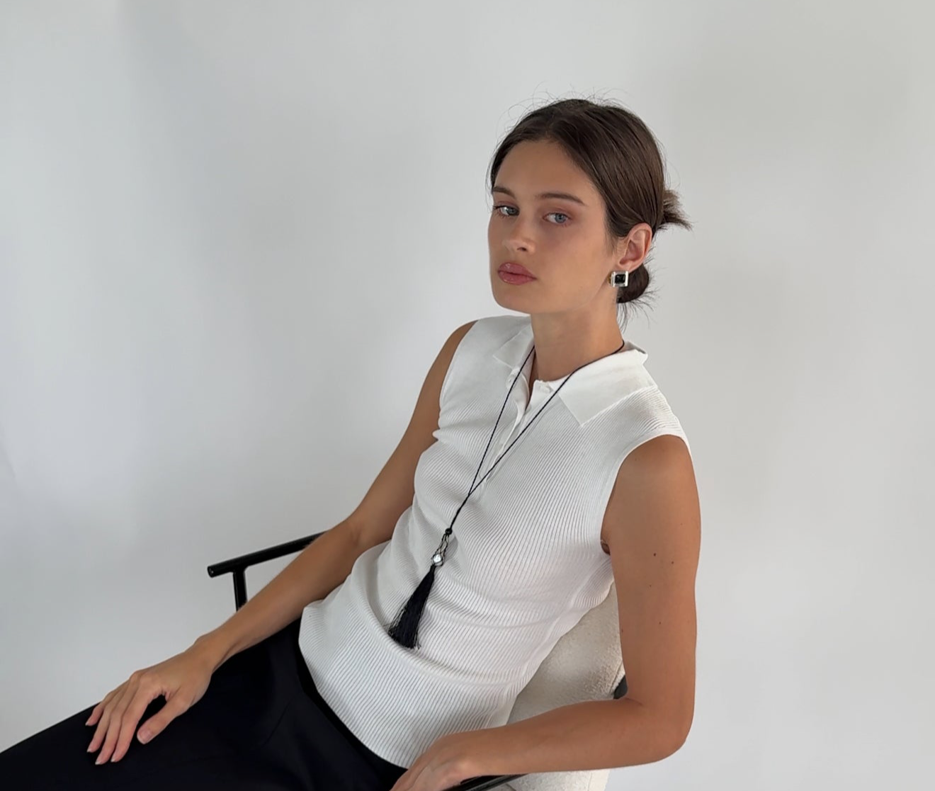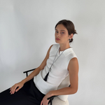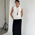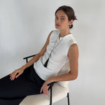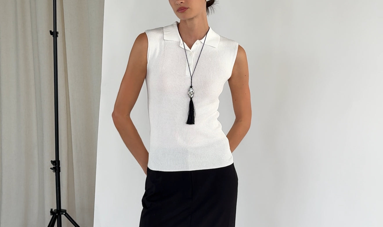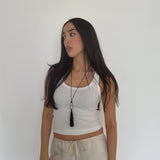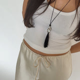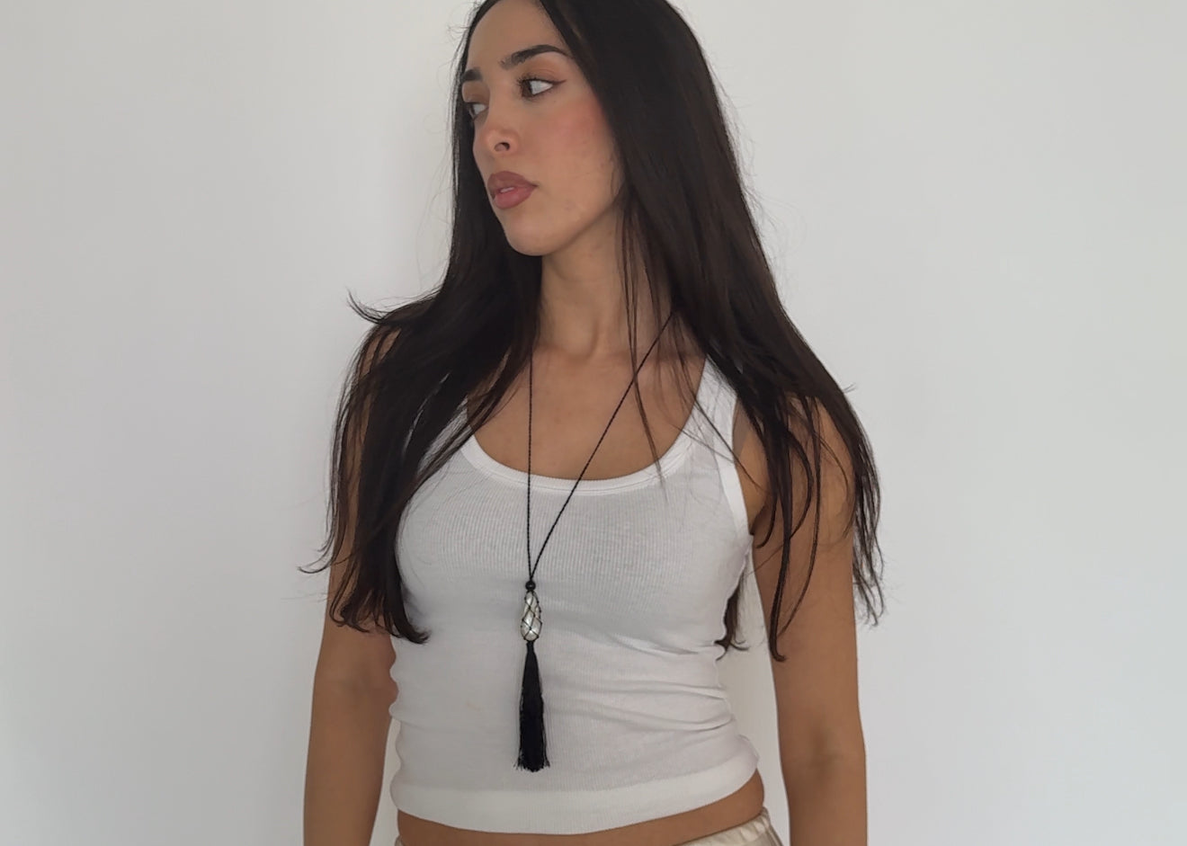 Caspian an ode to the sea. A pearl meticulously wrapped in a net and accompanied by three onyx beads. Featuring a hand wrapped tassel to tie it all together.