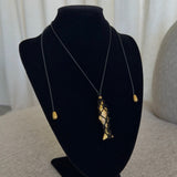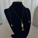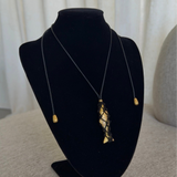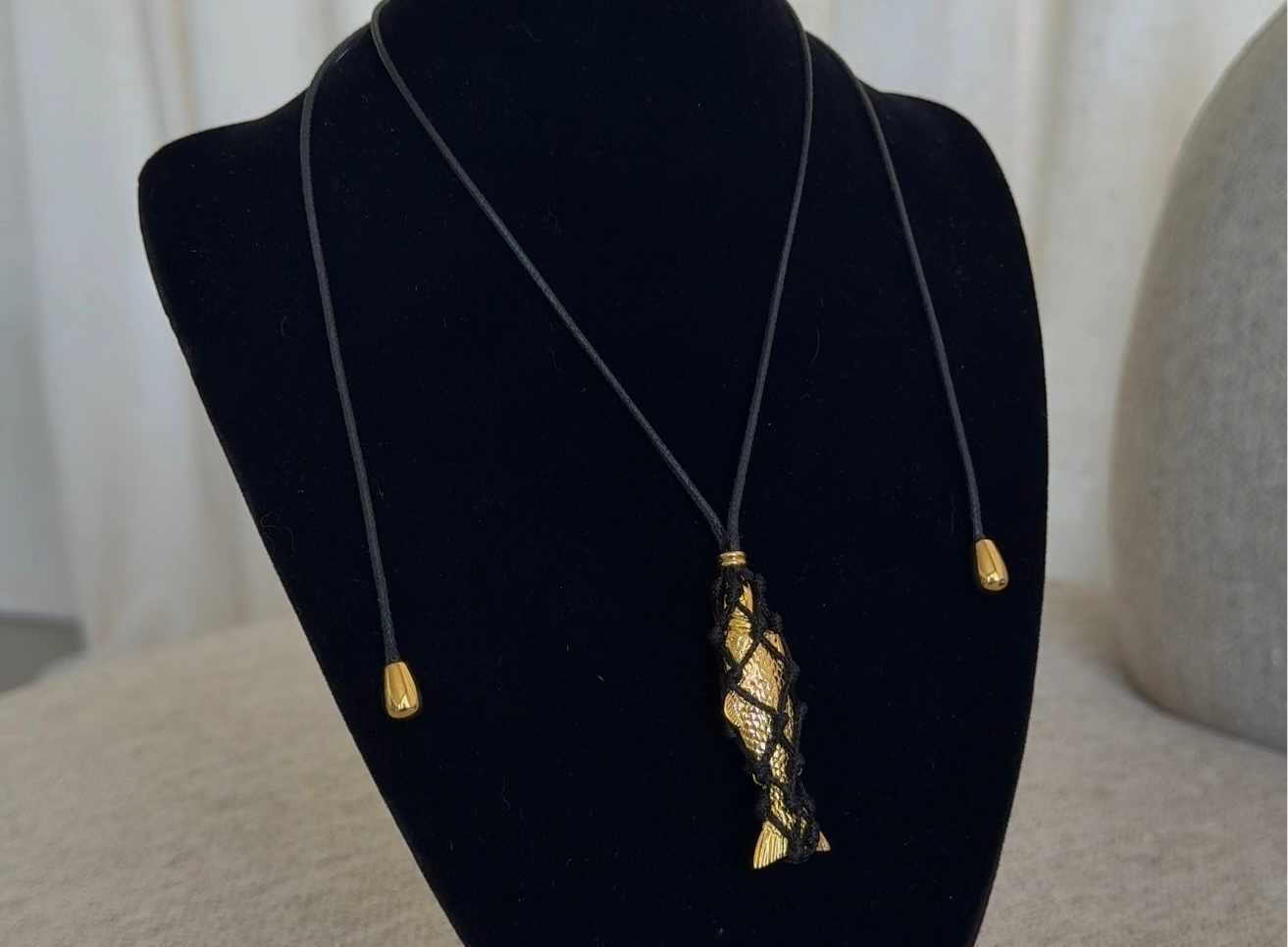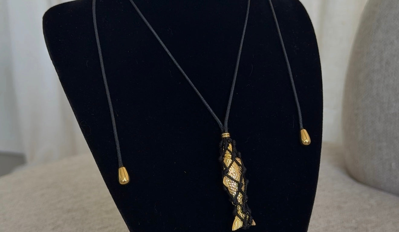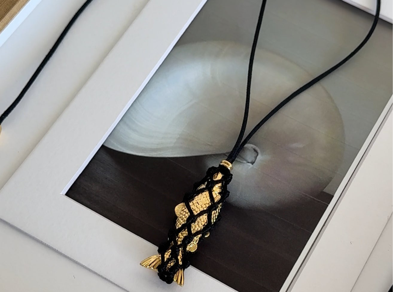 The Pisces, a fish wrapped in black corded net. An ode to the Earth.