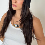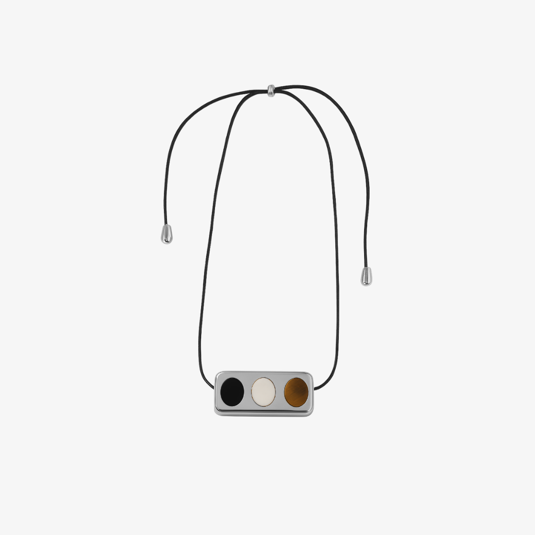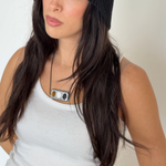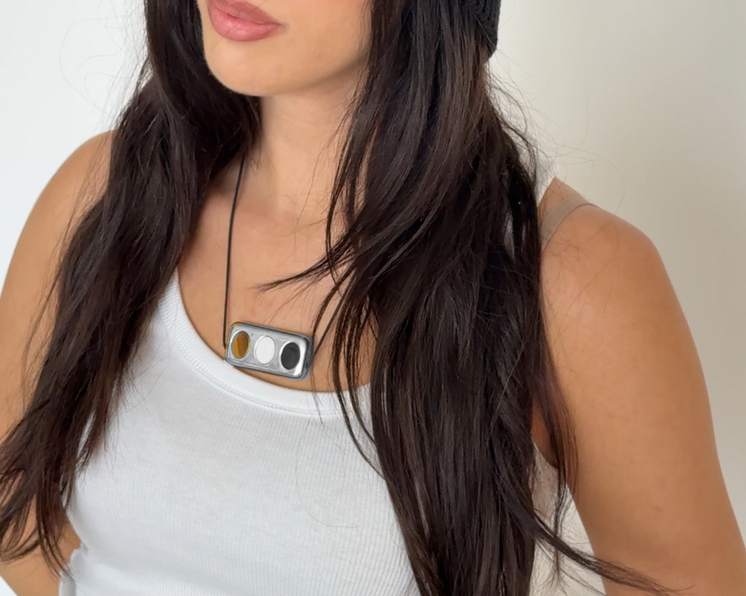 The Anaïs, one necklace two ways to wear. One side has three stones, symbolizing the body mind and soul. And when you reverse, a simplistic pendant.